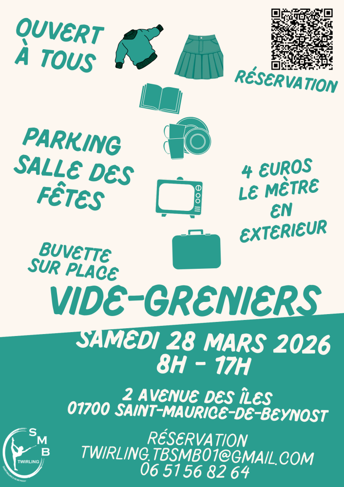 Le Club de Twirling Bâton de Saint-Maurice-de-Beynost (TBSMB) a le plaisir de vous inviter à participer à son vide-greniers, qui se tiendra : Derrière la Salle des fêtes de Saint-Maurice-de-Beynost
