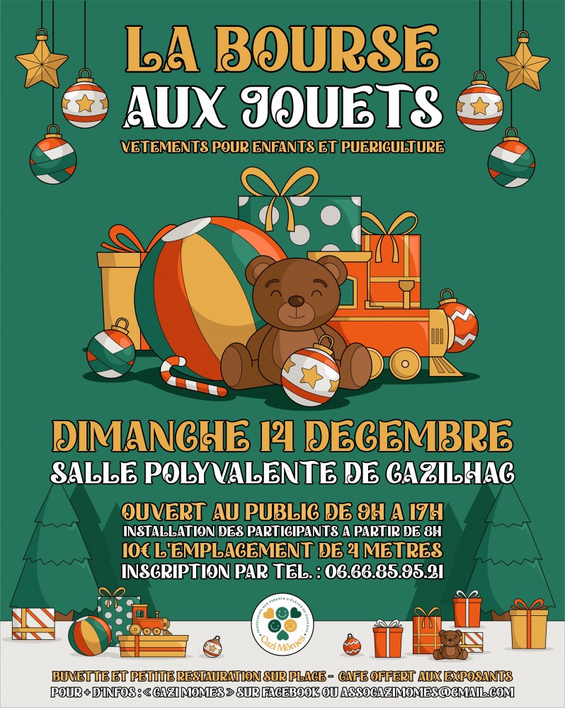 L'association Cazi Mômes organise sa « bourse aux jouets, aux vêtements pour enfants et aux articles de puériculture »le dimanche 14 décembre de 9h à 17h à la Salle Polyvalente de Cazilhac (11).