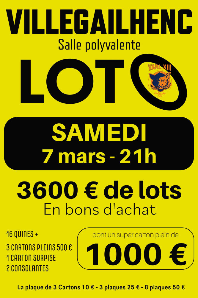 Villegailhenc Aragon rugby league (VARL) organise un loto le samedi 7 mars (21h) avec 3600 € de lots en bons d’achat.
