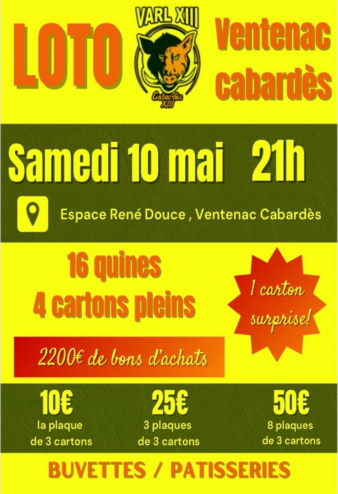 Les joueurs du club de rugby du VARL XIII proposent un loto ce samedi 10 mai (21h) à la salle René Douce de Ventenac-Cabardès. Avec 2 200 € de lots. Pour les quatre cartons pleins ce seront : 200 €, 300 €, 400 € et 500 €
