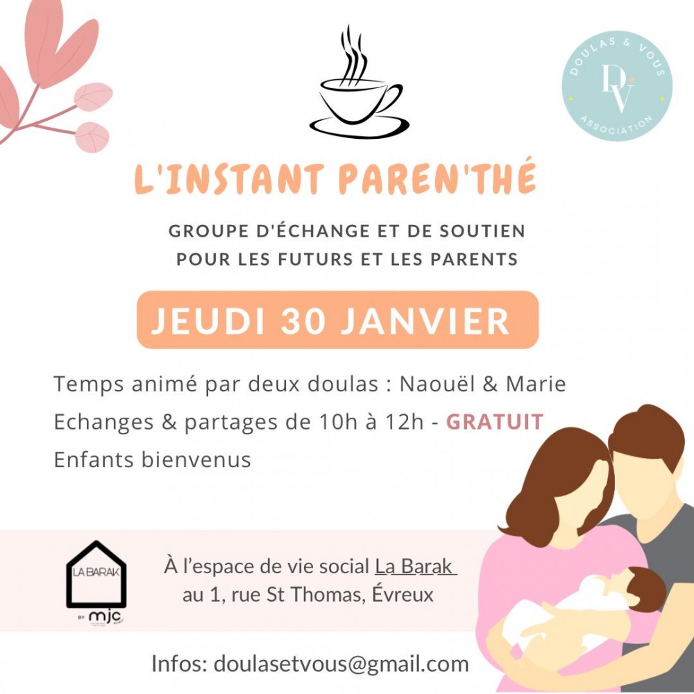 Dans un environnement accueillant, convivial et chaleureux, venez échanger avec d’autres parents autour de vos ressentis, de vos expériences et de vos questionnements en lien avec la maternité, la paternité et la parentalité.