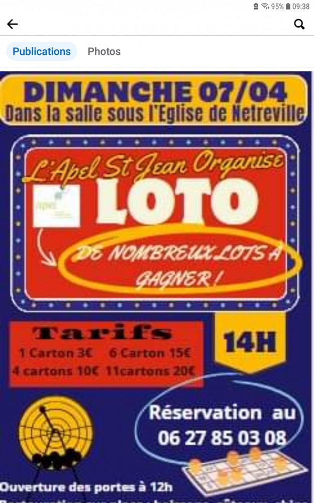 Loto organisé par l'APEL de l'école St Jean au profit des enfants de l'école. Nombreux lots. Accueil dans la salle de l'espace nétreville à partir de 12 h.
