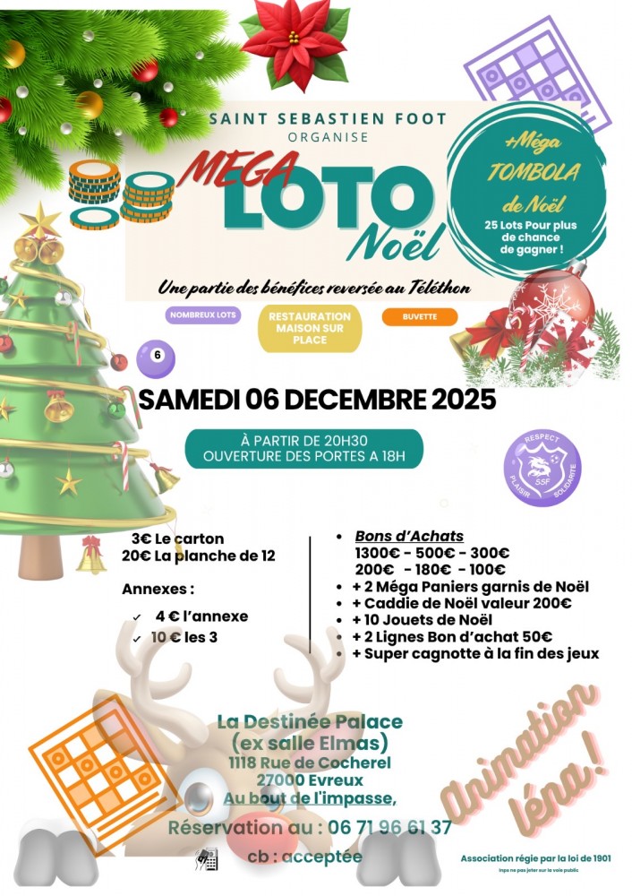 Loto de Noël animé par Lena, le club vous propose des bons d’achat de 50 à 1300€, des jouets, paniers et caddies garnis. Mais aussi une tombola de Noël et la cagnotte à gagner à la fin