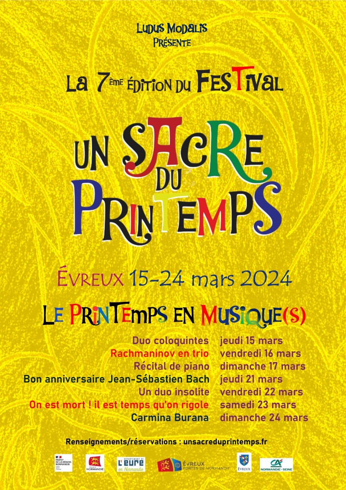 Nous sommes heureux de vous retrouver pour cette 7ème édition de notre festival. Elle sera à nouveau marquée du sceau de la diversité, celle des genres : musique instrumentale, vocale ou pour instrument soliste ; celle des styles : musique ancienne, romantique, moderne ou contemporaine ; et celle des lieux : médiathèque, églises, auditoriums. Une fois n’est pas coutume, la musique romantique, celle de l’immense Serguei Rachmaninov et de son illustre prédécesseur Beethoven, sera à l’honneur avec deux concerts qui leur seront consacrés. Vous serez conviés à d’étonnantes rencontres sonores comme celle de l’euphonium et de l’accordéon, de la viole de gambe et du violon ou à des découvertes comme la version dynamique et percussive de Carmina Burana et serez invités à fêter avec nous l’anniversaire de Johann Sebastian Bach !