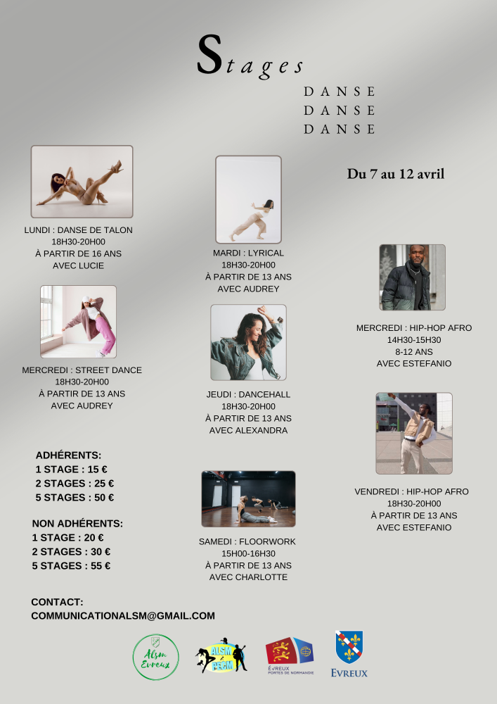 Rejoins-nous pour une semaine intense de danse et d'expression corporelle ! Du 7 au 12 avril, nous te proposons une série de stages variés pour explorer et développer ton talent dans des styles aussi dynamiques que créatifs. Que tu sois débutant(e) ou plus expérimenté(e), ces ateliers sont l’occasion parfaite de te perfectionner, d'apprendre de nouvelles techniques et de t’amuser !