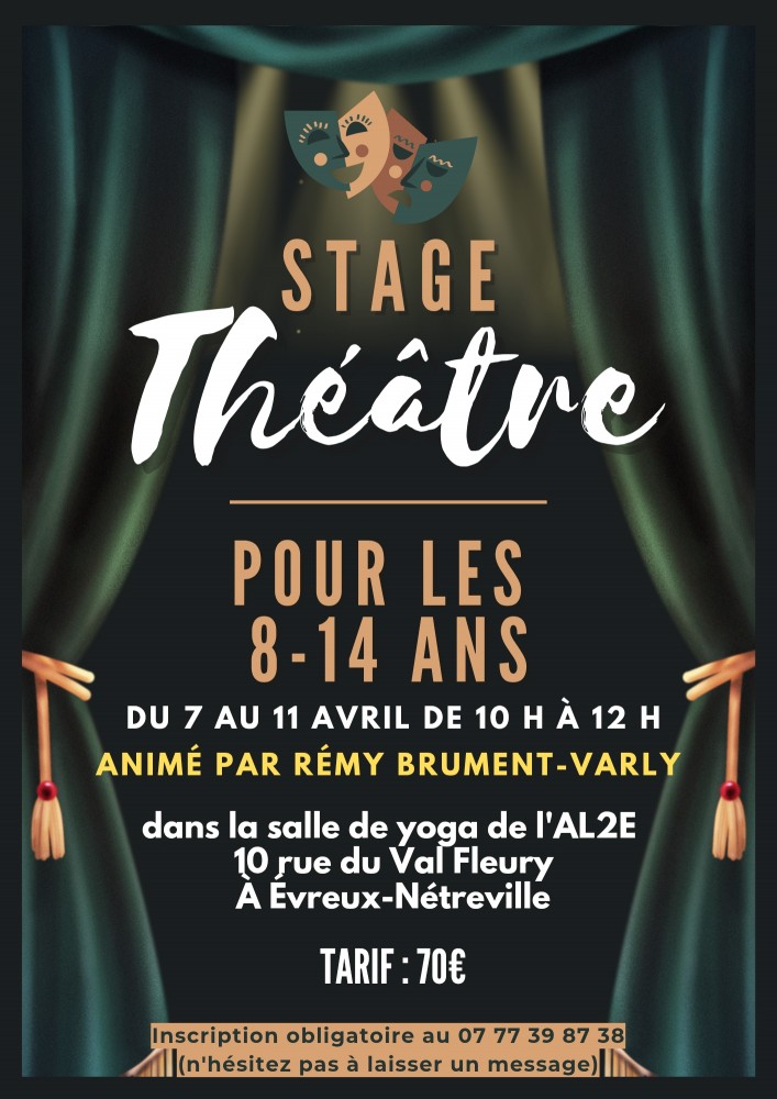 Stage théâtre pour les 8-14 ans. Tous les matins de 10h à 12h.