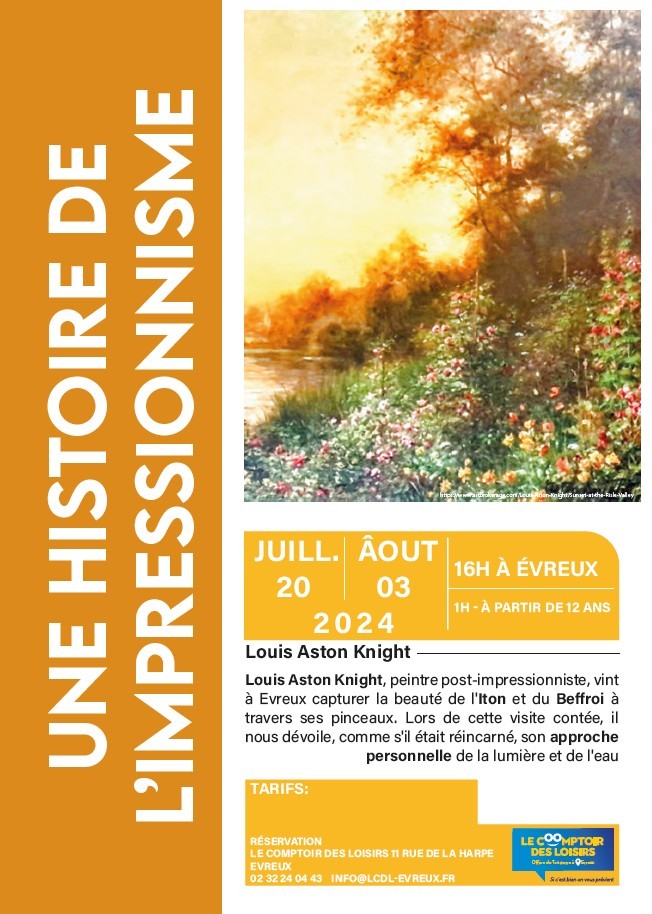 Louis Aston Knight, peintre post-impressionniste, vint à Evreux capturer la beauté de l'Iton et du Beffroi à travers ses pinceaux. Lors de cette visite contée, il nous dévoile, comme s'il était réincarné, son approche personnelle de la lumière et de l'eau.