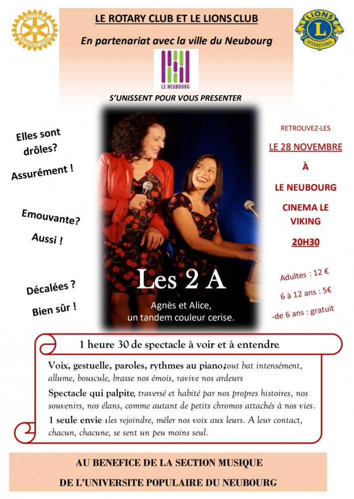 Le Rotary et le Lions Club en partenariat avec la ville de Neubourg s'unissent pour vous présenter « Les 2 A », 1 heure 30 de spectacle à voir et à entendre !