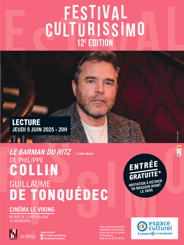 Le jeudi 05 juin, le centre E.Leclerc Le Neubourg vous invite au festival Culturissimo des Espaces Culturels E. Leclerc avec le comédien Guillaume de Tonquédec pour une lecture de Le Barman du Ritz de l’écrivain Philippe Collin.
