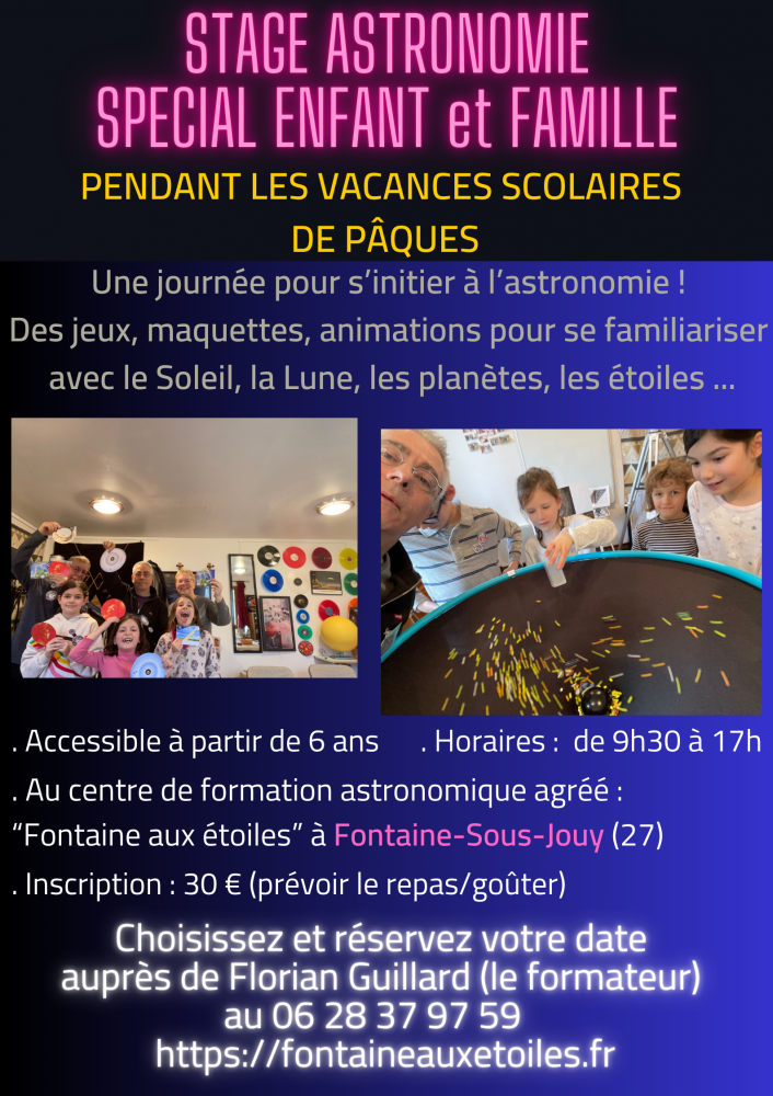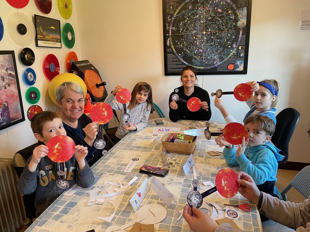 La durée est d'une journée. Il suffit de choisir une date entre le 07 avril et le 18 avril (sauf le 11). Les enfants avec ou sans leur parents ou grands-parents fabriquent leur carte du ciel et d'autres maquettes du système solaire.