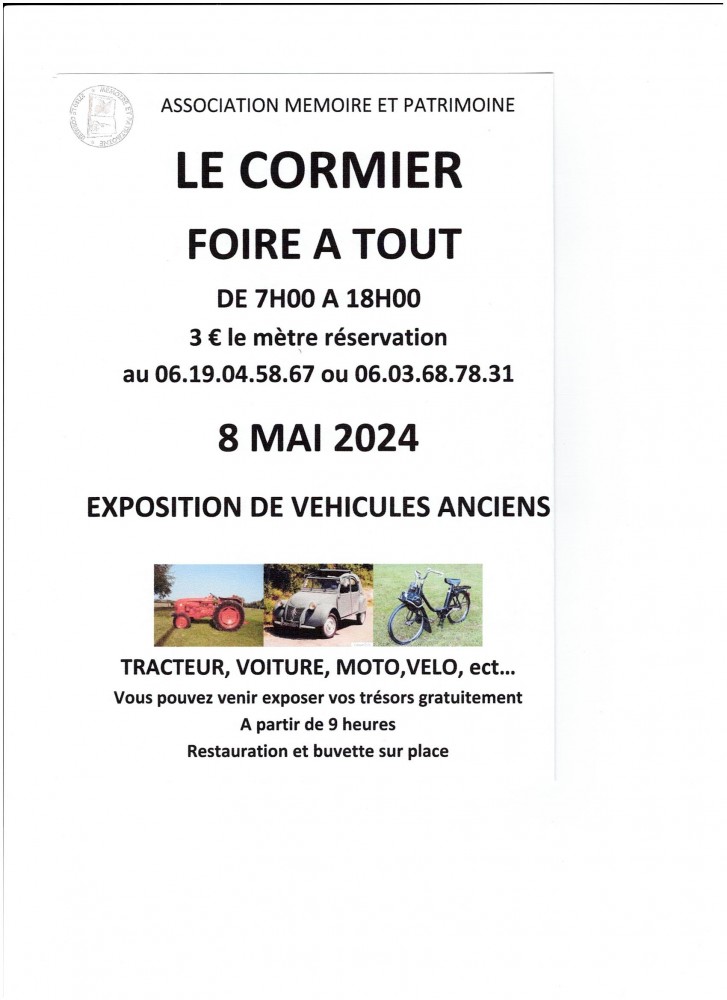 Nous organisons depuis plusieurs années, toujours le 8 mai, une foire à tout et une exposition de véhicules anciens, qui remporte chaque année un franc succès.