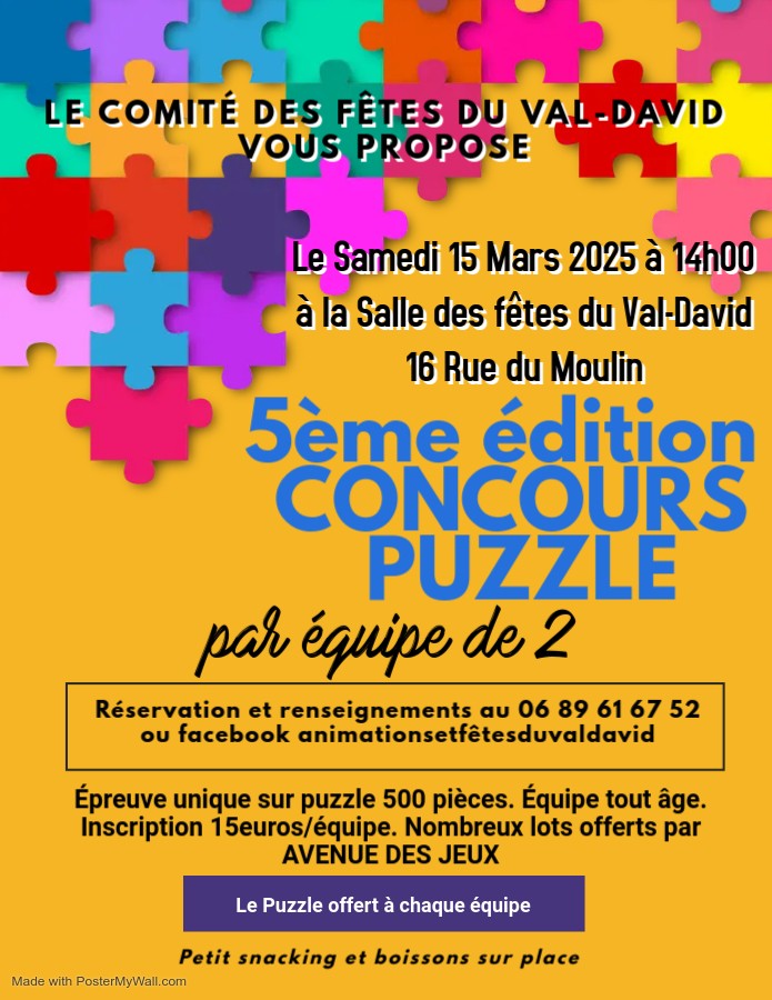 Le Comité des fêtes du Val-David organise un concours de puzzles, par équipe de 2, le samedi 15 février 2025 à 13h30 à la salle des fêtes, 16 rue du Moulin 27120 Le Val-David. Réservation obligatoire au 06.89.61.67.52 avant le 1er mars 2025.