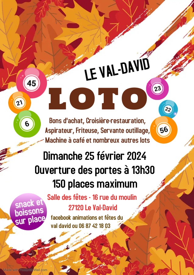 Loto du dimanche 25 février 2024 à 13h30. Réservation obligatoire.