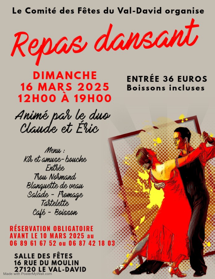 Le Comité des fêtes du Val-David organise un repas dansant le dimanche 16 mars 2025, animé par le duo Claude & Éric, à 12h00 à la salle des fêtes, 16 rue du Moulin 27120 Le Val-David. Réservation obligatoire au 06.89.61.67.52 avant le 10 mars 2025