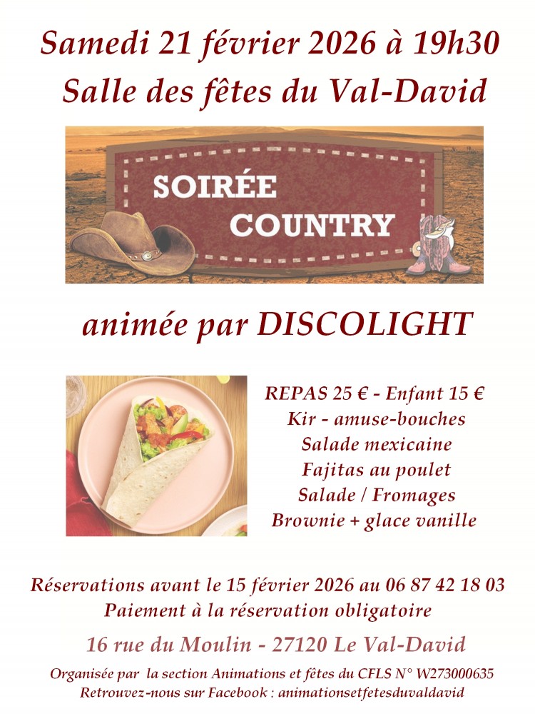 Le Comité des fêtes du Val-David organise à la salle des fêtes, 16 rue du Moulin 27120 Le Val-David, une soirée Country le samedi 21 février 2026 à 19h30. Réservation obligatoire au 06.87.42.18.03 avant le 15 février 2026. Voir détails sur l’affiche.