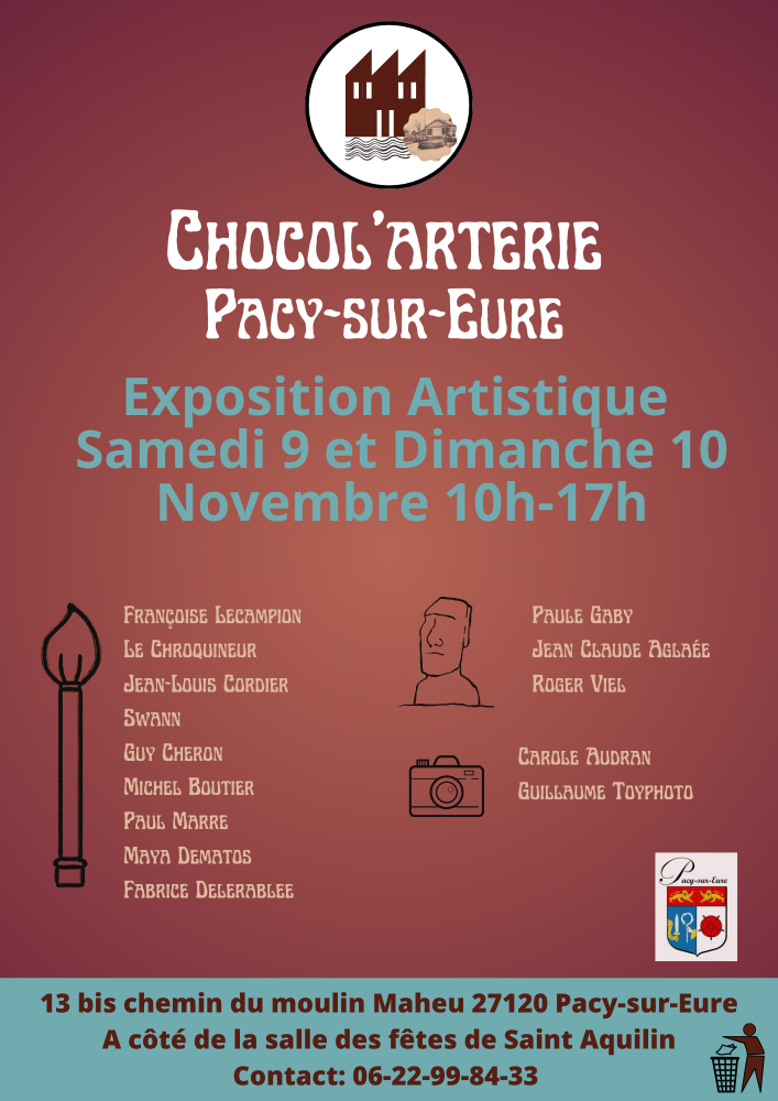 Pour sa deuxième année, la Chocol'arterie propose de découvrir des artistes locaux peintres, sculpteurs, photographes lors de son exposition hivernale le week end du 9 et 10 novembre prochain de 10h à 17h