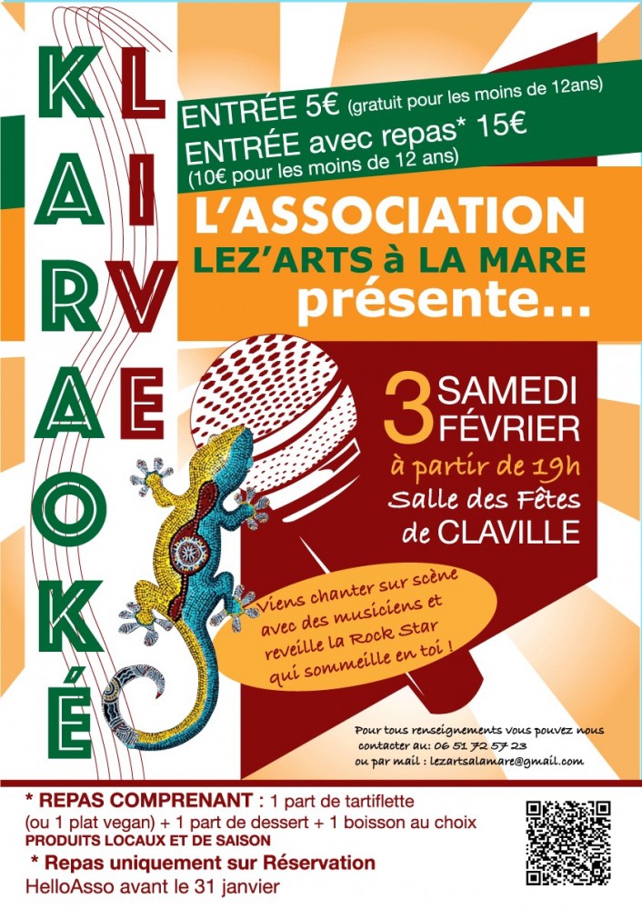 Voici le lien HelloAsso pour s’inscrire (réservation obligatoire pour la tartiflette) : https://www.helloasso.com/associations/lez-artsa-la-mare/evenements/soiree-karaoke-live-et-tartiflette