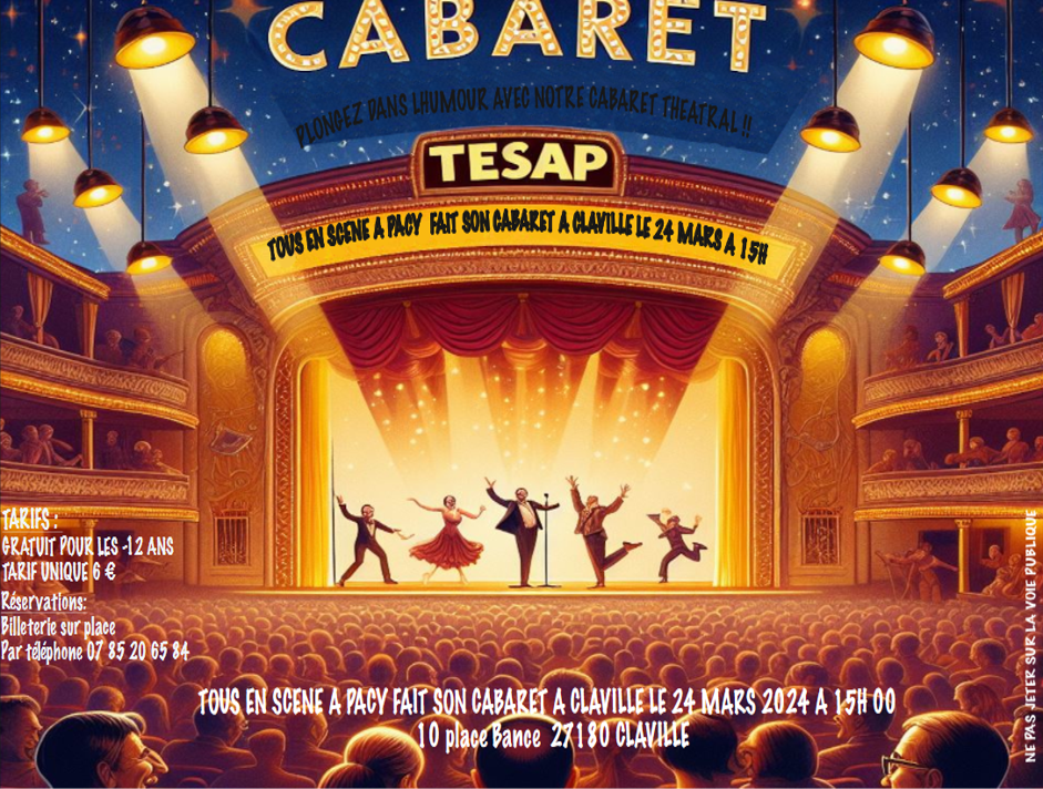 Le dimanche 24 mars (15h) : Plongez dans l'humour du spectacle de cabaret proposé par la compagnie Tous En Scène A Pacy à la salle des Fêtes de Claville !