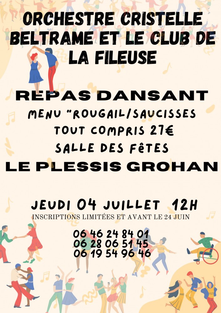 Repas dansant, menu tout compris Rougail Saucisses, animé par l'orchestre Cristelle Beltrame.