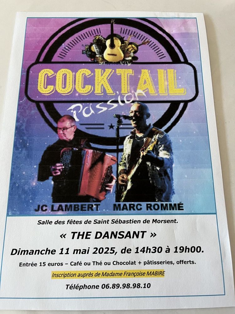 L’Association des Médailles Militaires d’Evreux organise à la Salle des fêtes de Saint Sébastien de Morsent un thé dansant le dimanche 11 mai 2025 de 14h30 à 19 h animé par Cocktail Passion