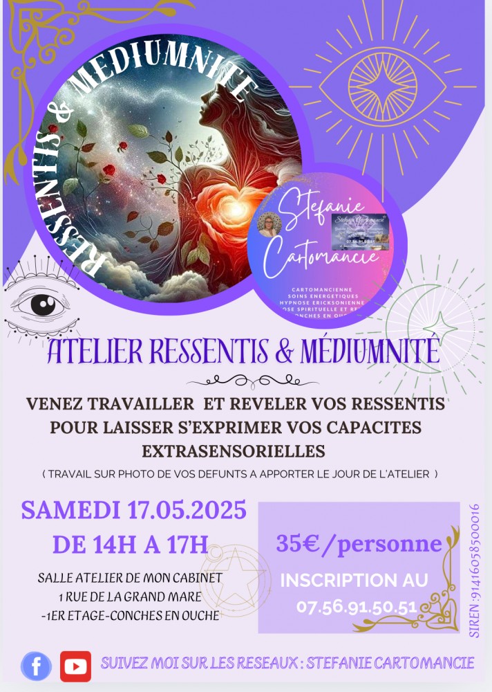 travailler ses ressentis et developer sa médiumnité ,tout comme tout autre expérience ésotérique, doit être faite en conscience ,avec bienveillance et avec précaution et je vous propose à travers cet atelier de vous transmettre les bonnes bases d’apprentissage , de protection et de vous accompagner dans cette nouvelle expérience spirituelle .