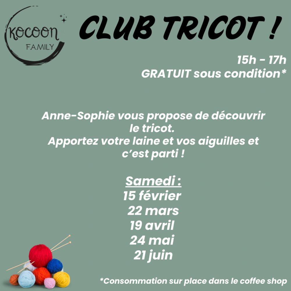 Rejoignez notre Club Tricot, un rendez-vous mensuel pour découvrir l’univers du tricot en toute convivialité. 1 samedi par mois, pendant 2h Avec l’aide d’Anne-Sophie, trocoteuse orpère, vous serez accompagné(e) dans vos premiers pas et pourrez démarrer vos projets avec confiance !Que vous souhaitiez tricoter une écharpe, un bonnet, ou même un pull, c’est l’occasion rêvée pour apprendre et partager vos astuces avec d’autres passionnés.