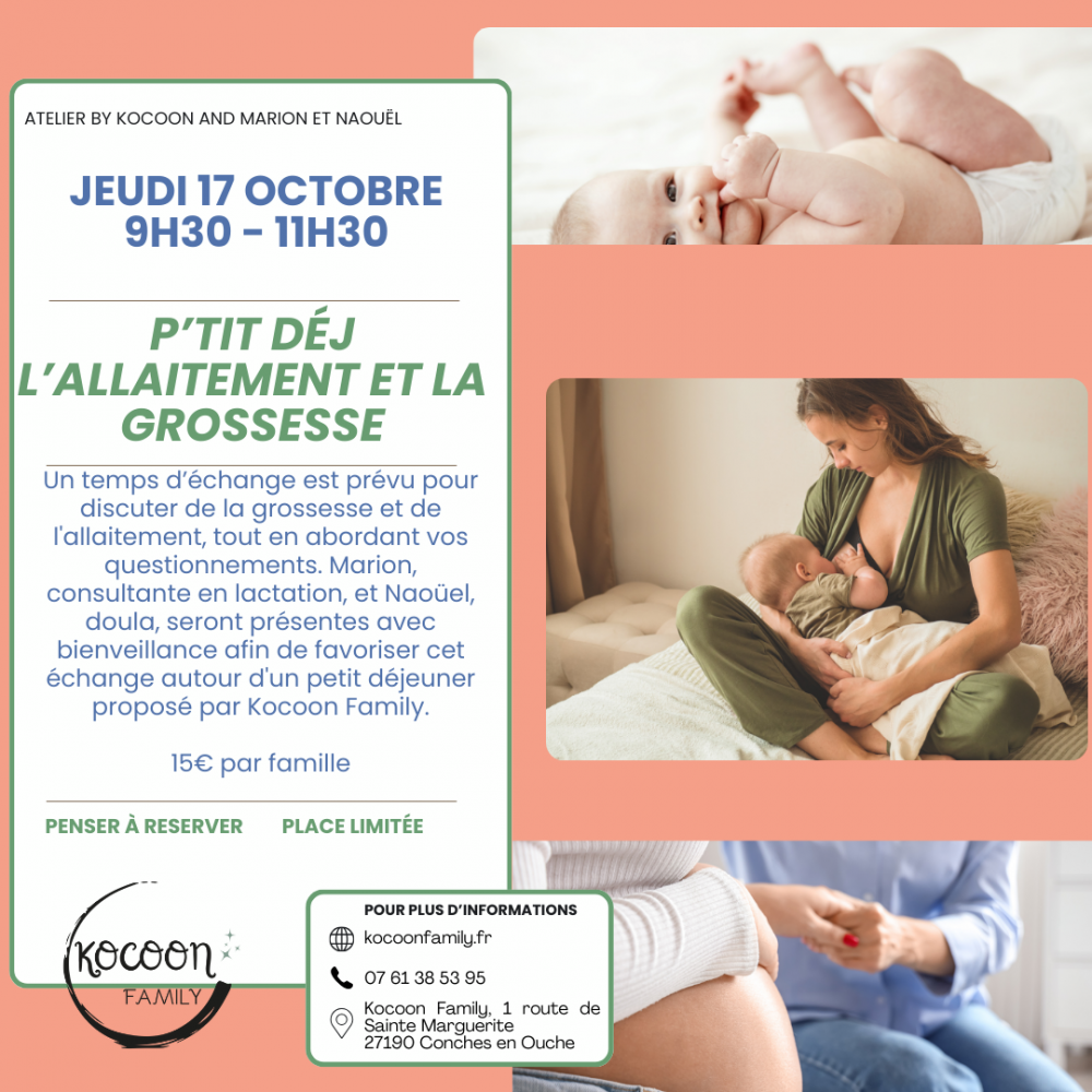 Un temps d’échange est prévu pour discuter de la grossesse et de l'allaitement, tout en abordant vos questionnements. Marion, consultante en lactation, et Naoüel, Doula, seront présentes avec bienveillance afin de favoriser cet échange autour d'un petit déjeuner proposé par Kocoon Family.