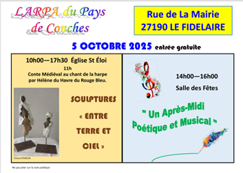 Dans la commune du Fidelaire, LARPA du Pays de Conches vous propose une journée artistique, culturelle et festive sous le signe de la créativité et de l'imaginaire. 14 sculpteurs vous présenteront leurs œuvres, une harpiste vous narrera un conte médiéval à 11h. L’après-midi une animation musicale et poétique sera présentée dans la salle des fêtes. Cet événement est une occasion unique de plonger dans le monde de l’art et de la culture. Que vous soyez passionné d’art ou simplement curieux, il y aura de quoi vous émerveiller et vous inspirer tout au long de la journée. N’oubliez pas d’apporter votre curiosité et votre enthousiasme pour profiter pleinement de cette expérience !