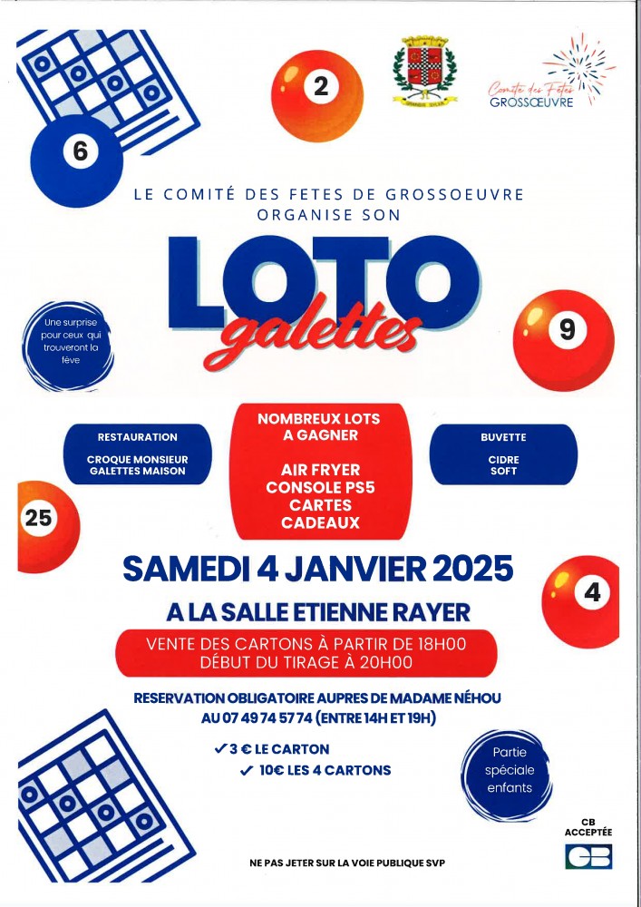 Le comité des fêtes de Grossoeuvre organise un loto/galettes le samedi 4 janvier 2025 à partir de 20h00 (ouverture des portes à 18h00).