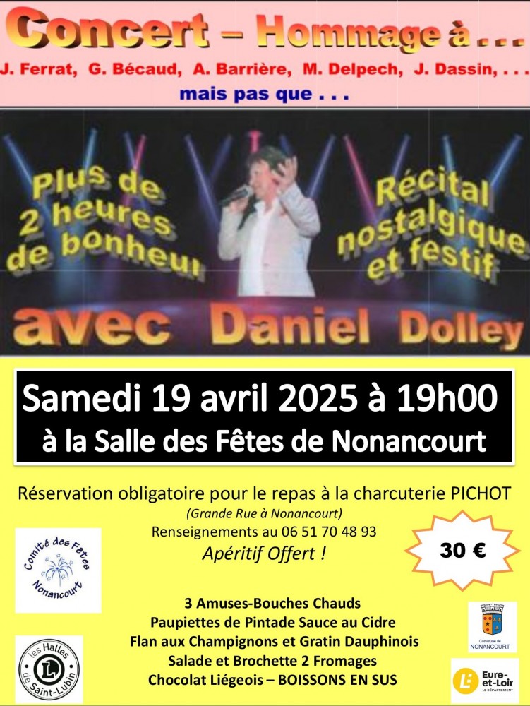 Soirée hommage des plus grands chanteurs des années 50/60/70 interprété par Daniel Dolley. Repas servis à table.