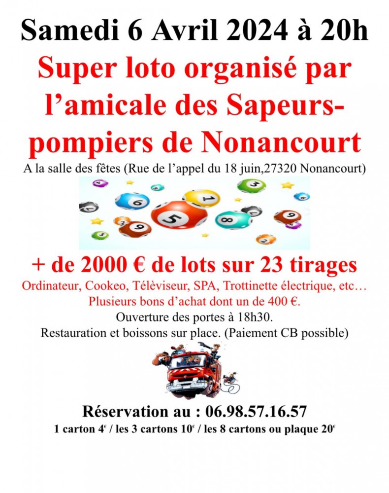 Super loto organisé par l’amicale des sapeurs pompiers de Nonancourt. Plus de 2000€ de lots sur 23 tirages.
