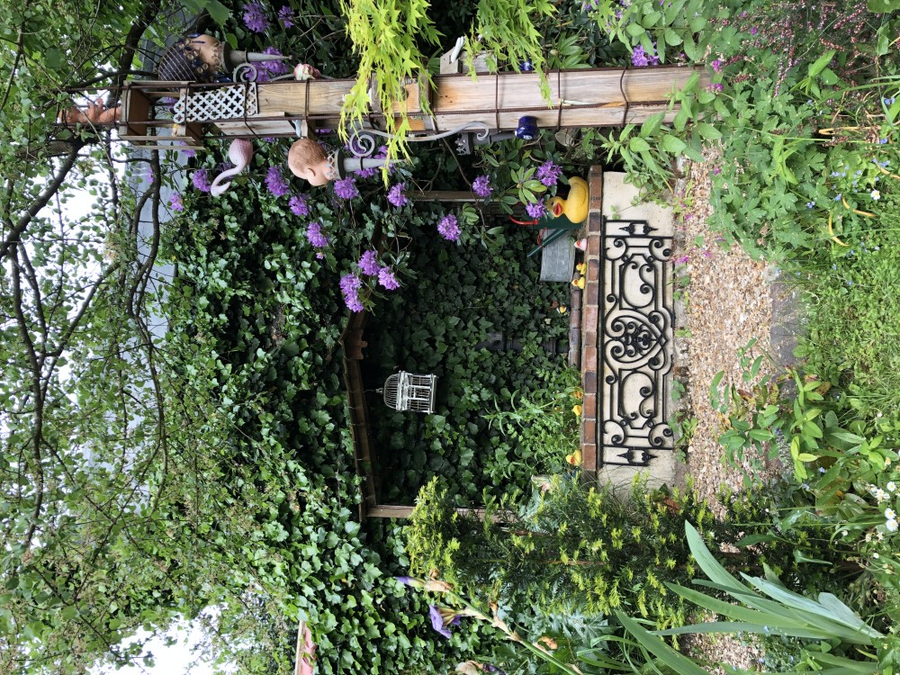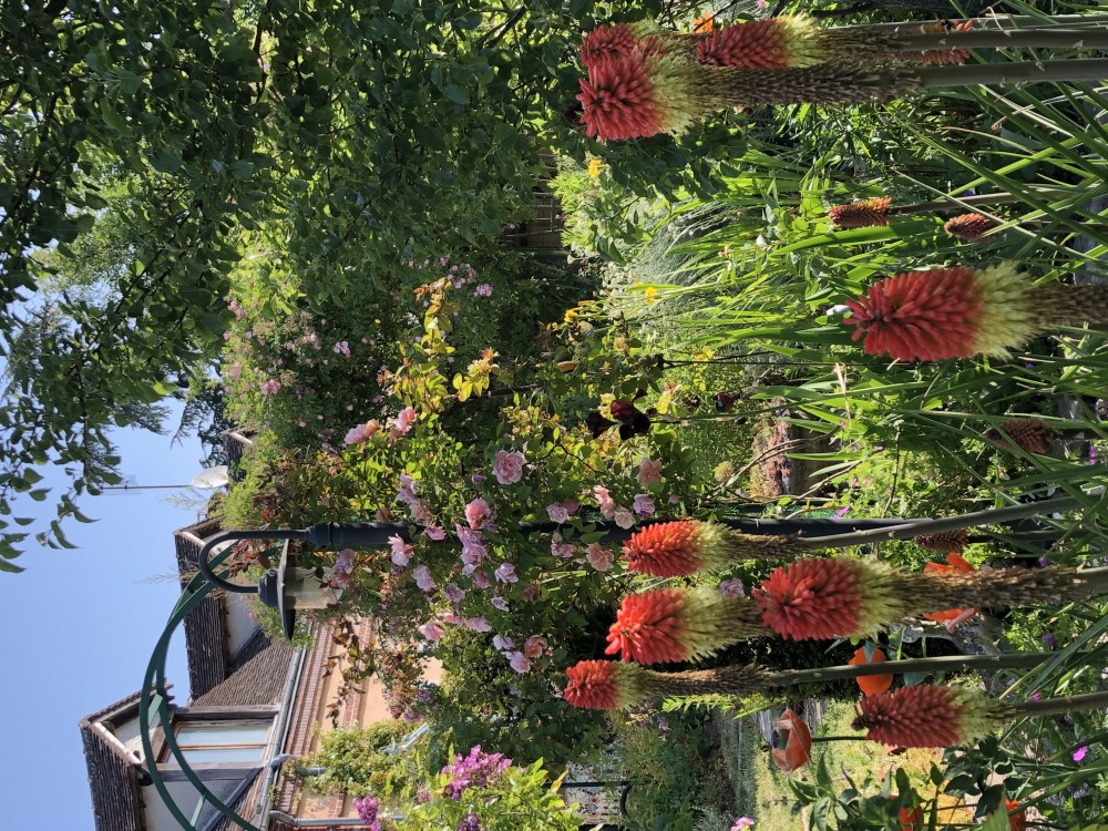 Parmi les plantes vivaces et les rosiers grimpants sont disséminées les constructions des artistes qui ont investi ce lieu.