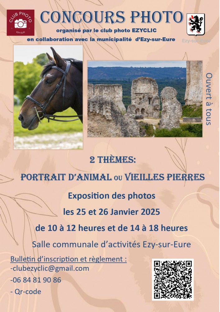 Cette année les thèmes seront « Portrait d’animal » ou « Vielles pierres ». Il se déroulera les 25 et 26 Janvier 2025 dans la salle d’activité communale de la ville d’Ezy-Sur-Eure.