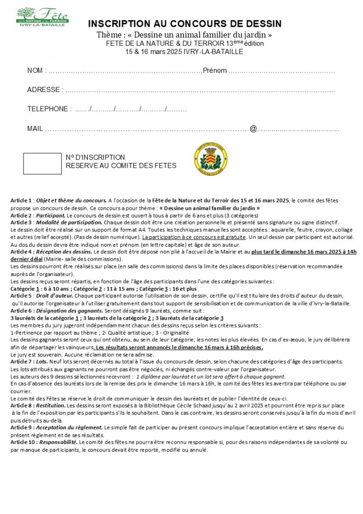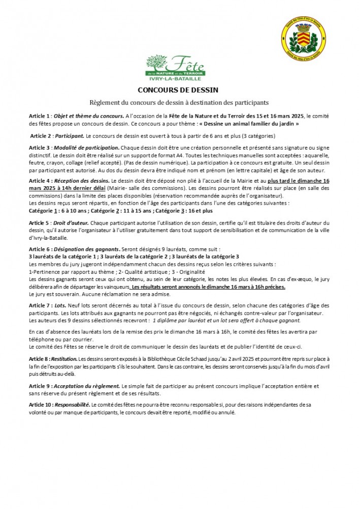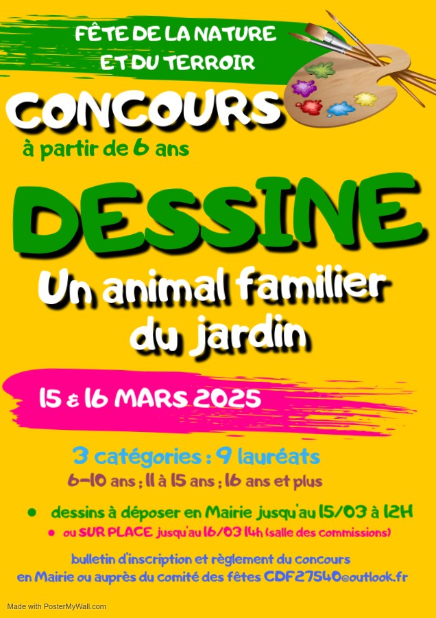 Avec la collaboration de l’association CALS et la Bibliothèque Cécile Schaad, un CONCOURS DE DESSIN sur le thème « Dessine un animal familier » est ouvert à tous à partir de 6 ans. Dépôt des dossiers en Mairie et AVANT LE 16 MARS 12H (directement en salle des commissions). Les dessins du CONCOURS seront exposées dans la salle des commissions. 9 lauréats se verront décernés des prix ( 3 par catégorie d’âge 6-10;11-15;16 ans et plus).