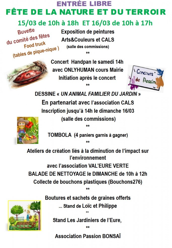 L'association Val'Eure Verte viendra présenter aux visiteurs leurs actions et tiendra un stand pour vous faire découvrir leurs actions. Atelier à base de récupération, des bombes à graines pour planter des fleurs et des pommes de pin avec des graines pour nourrir les oiseaux. Le dimanche 16 mars, balade de nettoyage de 10h à 12h dans les rues d'Ivry-la-Bataille et un atelier CPN de 14h à 16h avec comme objectif de réaliser des nichoirs à mésanges et vanneries sauvages pour mangeoires à oiseaux. Le stand sera donc ouvert sur ce créneau pour les participants aux deux ateliers (sur réservation au 06.67.83.70.21).