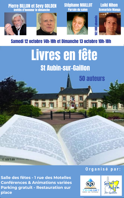 Salon « Livres en fête » samedi 12 octobre, de 14 h à 18 h et dimanche 13 octobre, de 10 h à 18 h, à la salle des fêtes . Atelier de calligraphie,Randonnée, Expo Hommage à Jean Mineray ; Parking gratuit. Rens : capagaillon@gmail.com ou tes-pas-cap-a-gaillon.fr