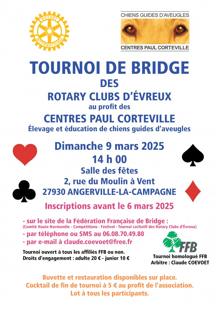 Les trois Clubs Rotary d’Évreux organisent le dimanche 9 mars un Tournoi de bridge par paires dont les bénéfices seront intégralement remis au centre Paul Corteville de Bourg-Achard, élevage et éducation de Chiens Guide d’Aveugles.