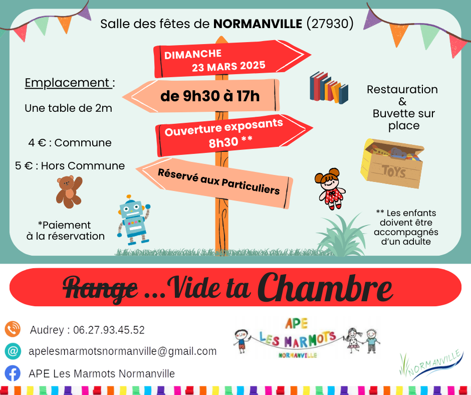 L'APE les marmots Normanville organise un Vide ta chambre le dimanche 23 mars de 9h30 à 17h00 dans la salle des fêtes de Normanville.
