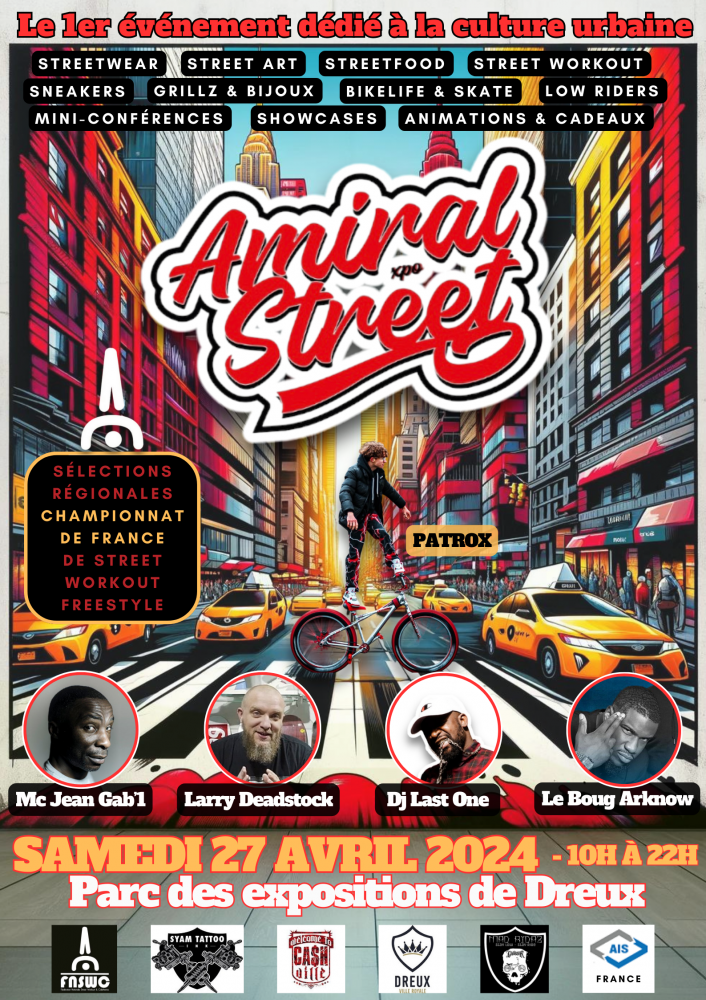 AMIRAL STREET X.PO est le 1er événement dédié à la culture urbaine : streetwear & sneakers, street art, street food et street workout, en présence de MC Jean Gab'1, Larry Deadstock, DJ Last One, Le Boug Arknow et Patrox.