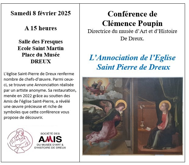 L'église Saint-Pierre de Dreux renferme nombre de chefs-d'œuvre. Parmi ceux-ci, se trouve une Annonciation réalisée par un artiste anonyme. Sa restauration, menée en 2022 grâce au soutien des Amis de l'église Saint-Pierre, a révélé une œuvre précieuse et riche de symboles que cette conférence vous propose de découvrir. A la découverte des maîtres du Quattrocento italien qui surent représenter l'un des plus grands mystères de la foi chrétienne : l'Incarnation, le Dieu fait Homme.