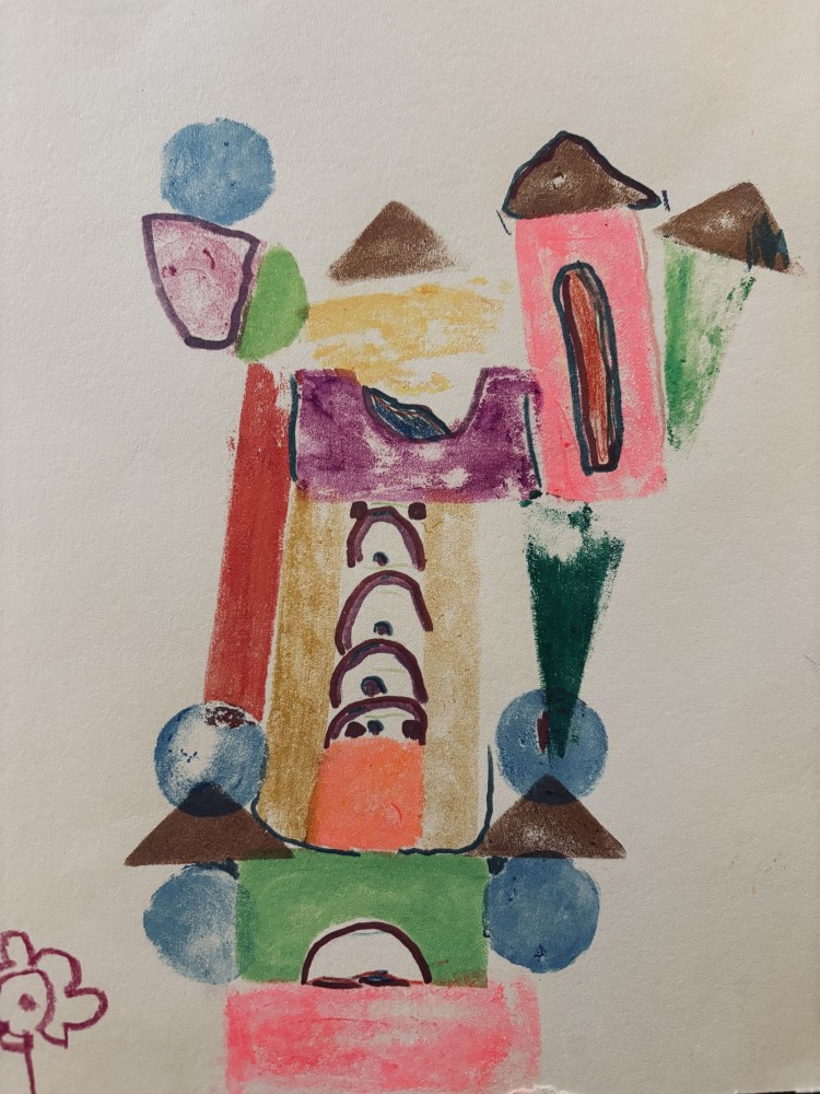 À l’aide de tampons aux formes variées, imagine et crée une très grande maison dans laquelle tu aimerais vivre avec tout plein de monde.