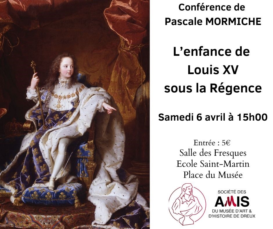 Orphelin à l'âge de deux ans, le duc d'Anjou puis dauphin de France devient en 1715 à la mort de son arrière-grand-père Louis XIV, le roi Louis XV à l'âge de cinq ans. La régence est exercée par le duc d’Orléans. C’est l’enfance de ce très jeune roi sous la régence que Pascale MORMICHE nous présente lors de cette conférence organisée par la Société des Amis du Musée de Dreux.