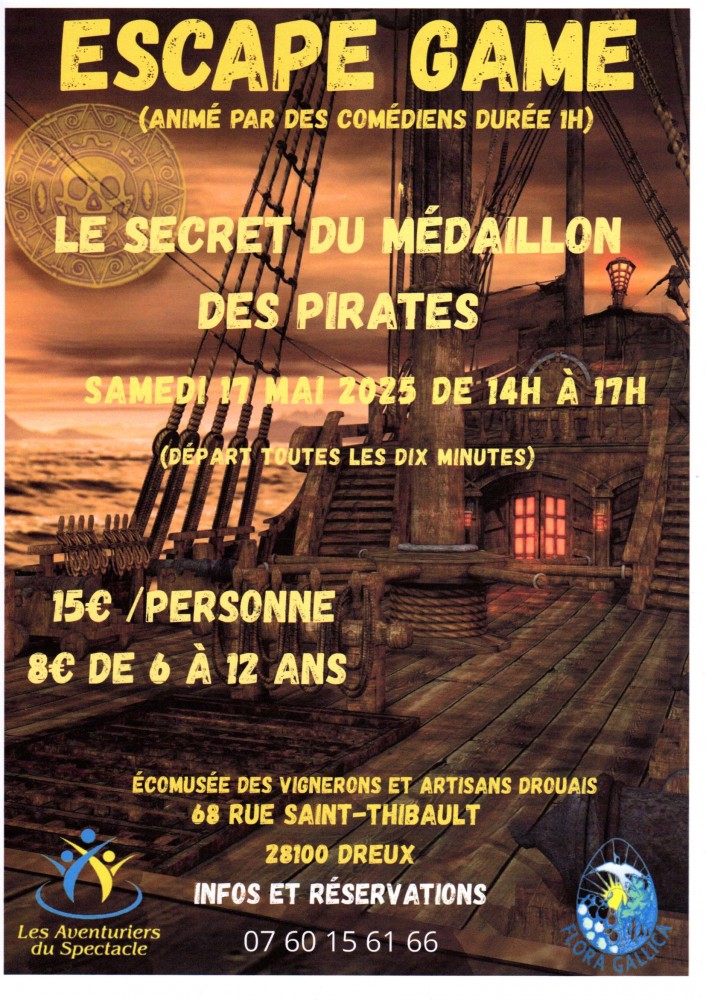 LE SECRET DU MEDAILLON DES PIRATES, Escape Game, animé par 15 comédiens (Les Aventuriers du spectacle) dans les salles de l’Ecomusée des Vignerons et Artisans Drouais, 68 rue Saint Thibault à Dreux. Parcours d’1 heure, départ (toute les 10 minutes) de 14 h à 17 h.