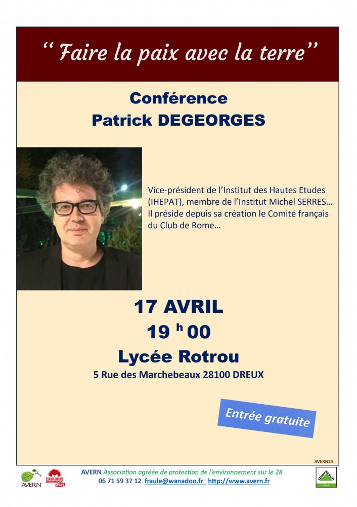 Conférence par Patrick DEGEORGES, vice-Président de l'Institut des Hautes Etudes (IHEPAT), membre de l'Institut Michel SERRES...Il préside depuis sa création le Comité français du Club de Rome..