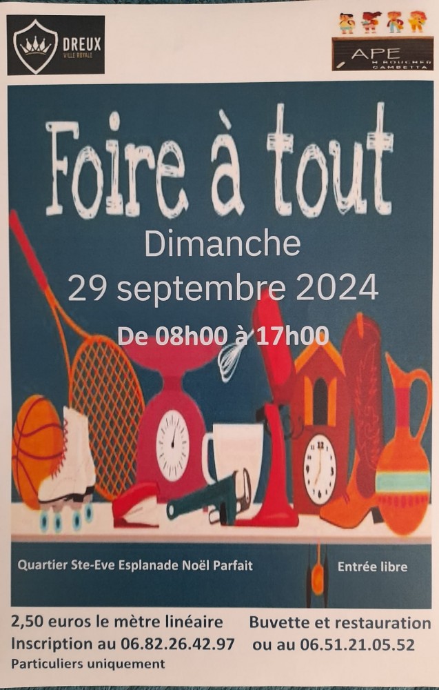 Foire à tout à Dreux quartier Sainte Eve , 2.50 le mètre linéaire. Buvette et restauration. Toilette pour les exposants.