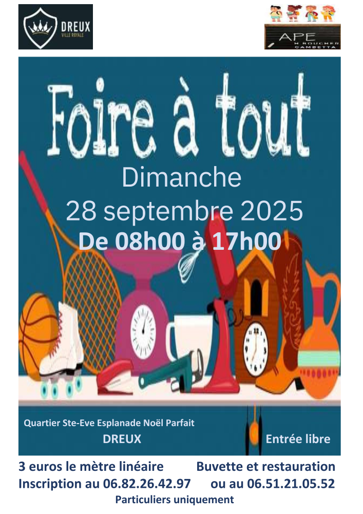 Foire à tout de l'APE Hélène Boucher Gambetta au niveau de l'Esplanade Noël parfait , la rue Marc Sangnier, le stade de foot et devant la Maison Proximum Sainte-Eve.