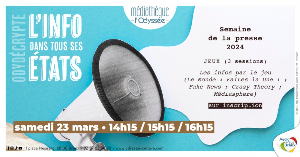 SEMAINE DE LA PRESSE : trois séances à 14h15, 15h15 et 16h15 pour découvrir les ficelles du métier de journaliste à travers les jeux « Le Monde : Faites la une ! », « Fake News », « Crazy Theory » ou encore « Médiasphère ».