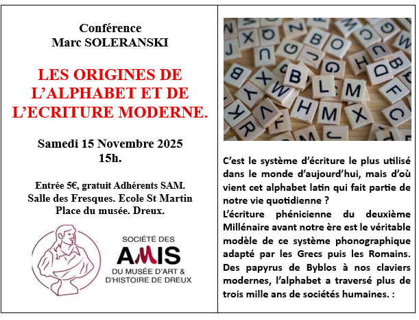 Conférence par Marc SOLERANSKI. Les Origines de l'alphabet et de l'écriture moderne.