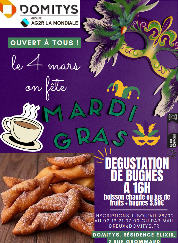 Dégustation de bugnes faits maison servi avec une boisson chaude ou froide.