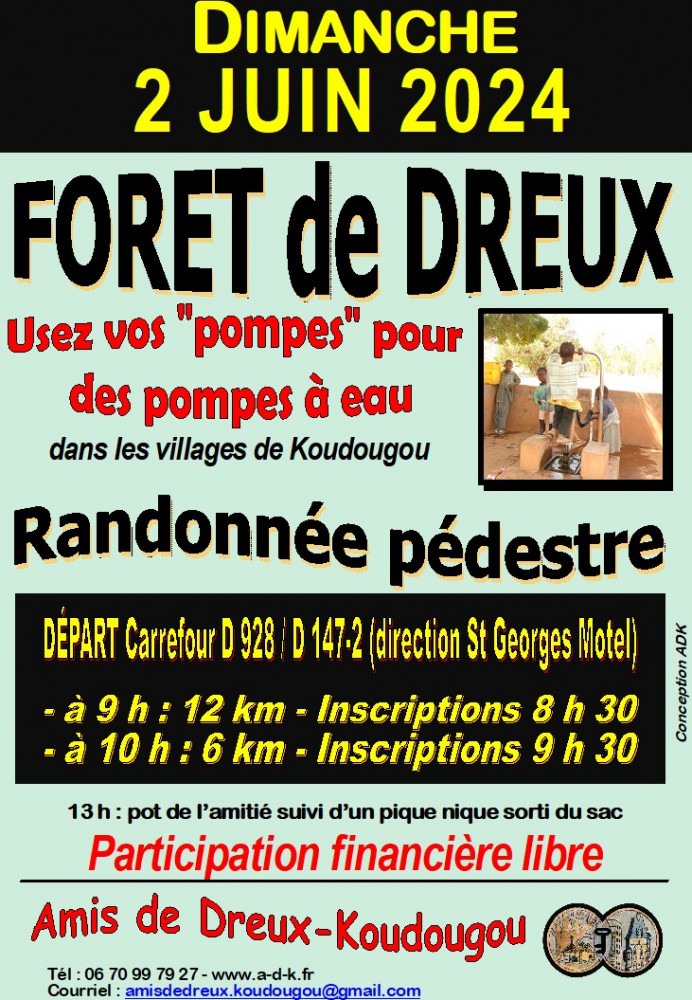 DIMANCHE 2 juin 2024 FORET DOMANIALE DE DREUX , Usez vos« pompes » pour des pompes à eau dans les villages de Koudougou